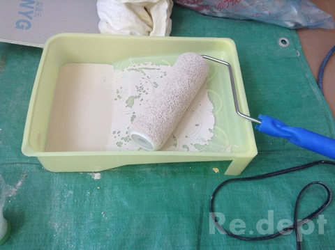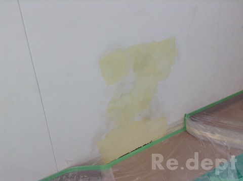 石膏ボードをはめ込み穴をふさぎます。周囲にパテをうち段差を解消。壁一面を水性塗料でローラー塗装です。