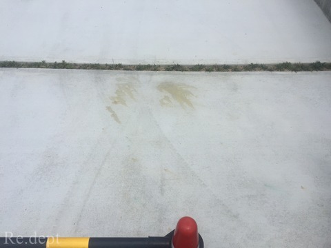 バッテリー液をこぼしてコンクリートが変色していた。まず、アルカリに中和させ、コンクリートの劣化を予防。