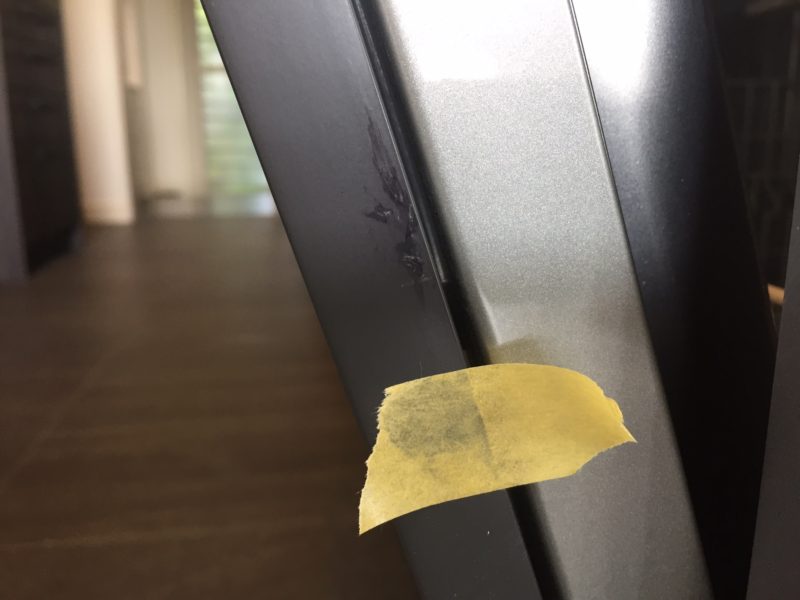 ステンレス部分と木パネルの両方に傷が付いてます。