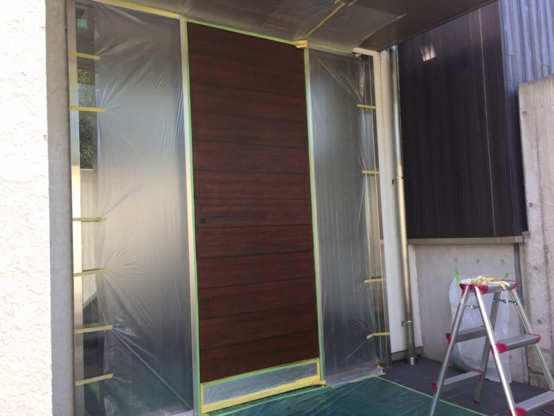 玄関ドアの現場塗装です。以前に数回塗り重ね塗装しているようです。