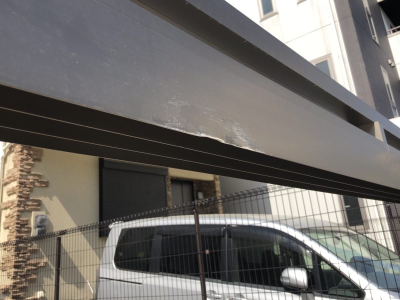 リフォーム中 車がゲートに当たってしまいへこんだようです。