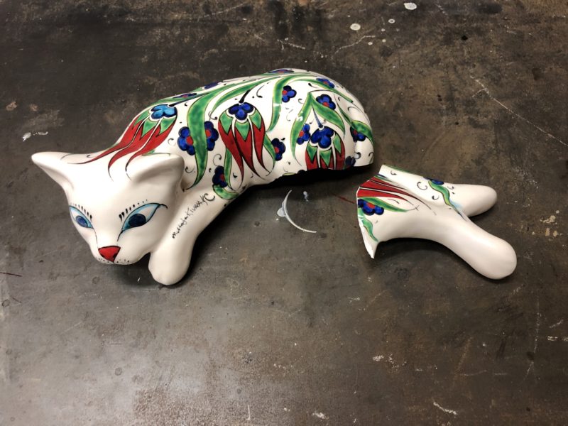 ネコの置物 陶器の割れ補修です。