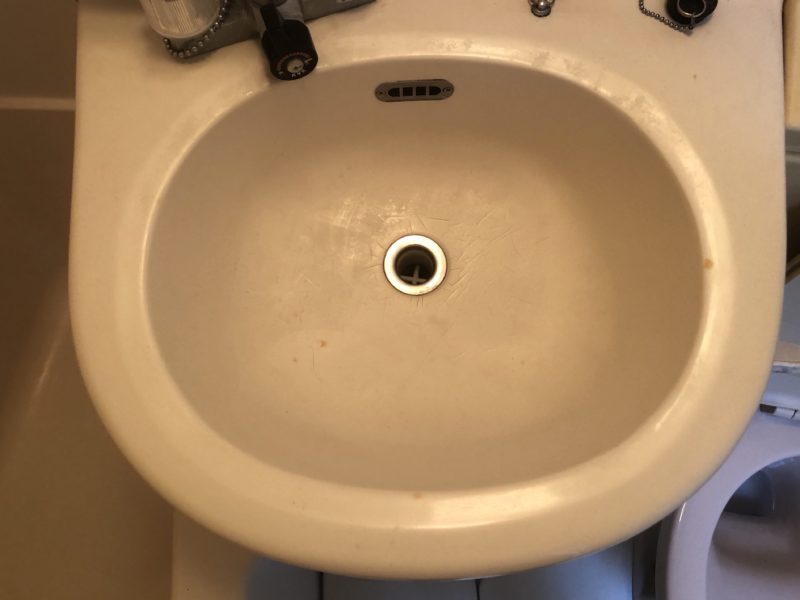 樹脂製の洗面ボウルです。ボウルだけの取替えは出来ないタイプです。研磨して表面を整え 塗装で仕上げます