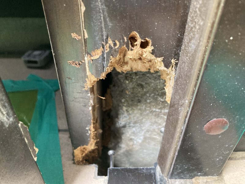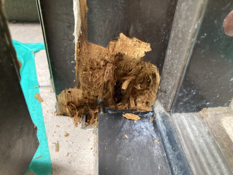 塗装が浮いている程度と考えてましたが、つっいてみると木部がブヨブヨ。結局木部はなくなり空洞です。
