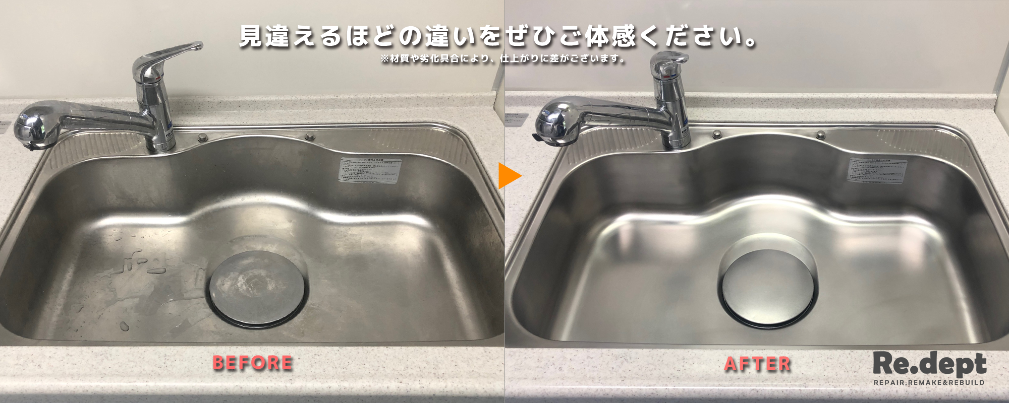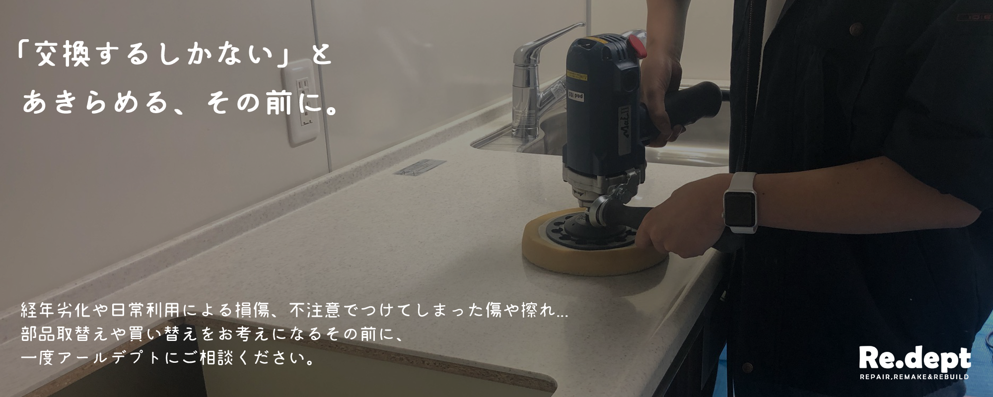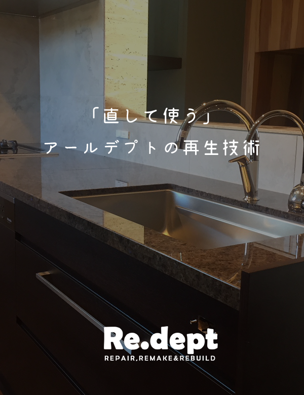 私どもアールデプトは、簡単には落ちない傷やサビ、水垢などの汚れを研磨と塗装で再生させるサービスを提供しております。これまでもキッチンやフローリングだけにとどまらず、家具やサッシ、時には自転車や店舗什器など、様々なものを再生してきました。