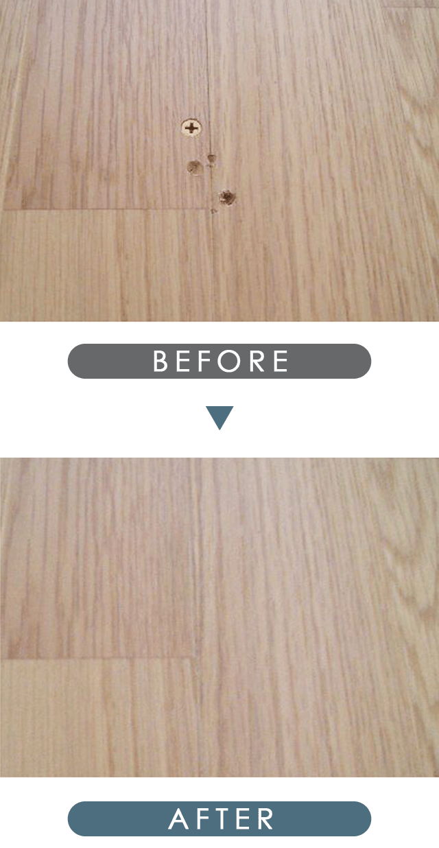 床鳴りの補修のためボンドを注入するも効果が無く、お客様の了承を得てビスを打ち込んで対応した際のビス穴を消して欲しい